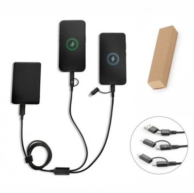 Cabo super-rápido 6 em 1 em alumínio 20% reciclado e PET 4% reciclado. Permite carregamento super-rápido de 60W via USB-C e transferência de dados. Apresenta uma entrada dupla USB-A/USB-C e duas saídas com duas portas USB-C que podem ser utilizadas em simultâneo.