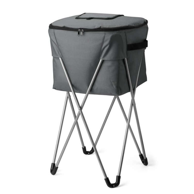 Cooler térmico de 62 litros. Fabricado em poliéster de alta resistência com revestimento interno em PEVA atóxico e soldado, evita vazamentos e mantém as bebidas geladas por muito mais tempo. Conta com uma tampa superior menor, que permite o acesso rápido sem perder a temperatura interna. Seu pedestal metálico garante sustentação firme e montagem prática, enquanto o estojo em poliéster facilita o transporte e o armazenamento. Um brinde funcional, moderno e com grande área de personalização, perfeito para divulgar marcas em ações promocionais e eventos de verão.