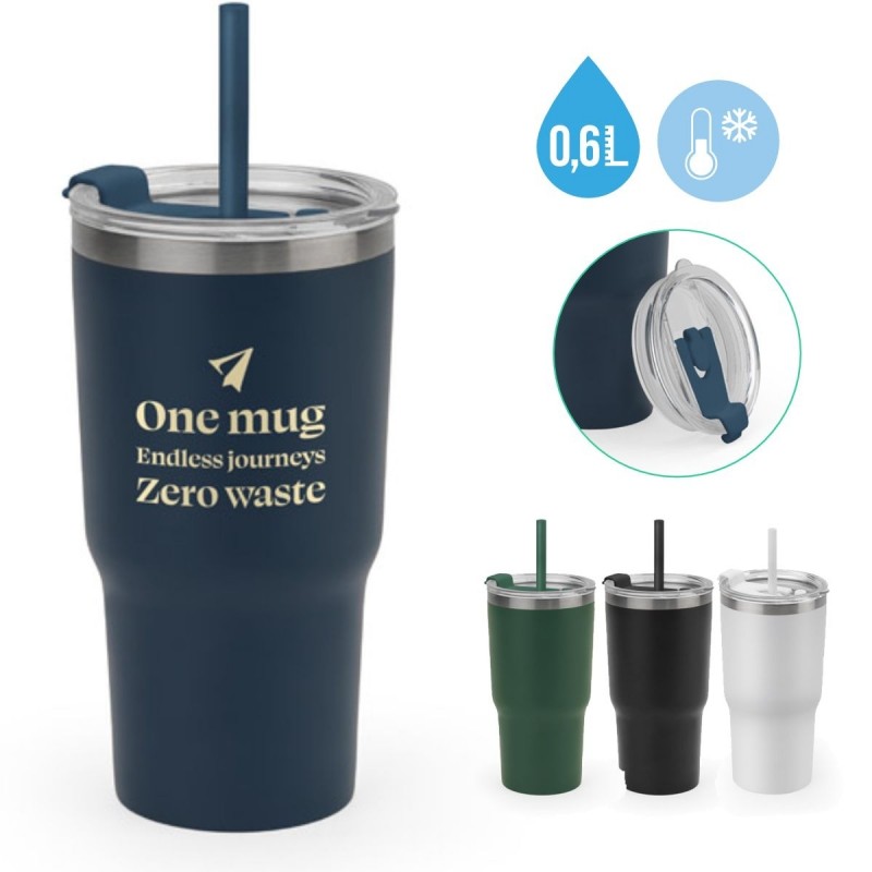 O copo de viagem em aço inox 91% reciclado é ideal para marcas que desejam se destacar com um presente ecológico e de alto valor percebido. Com parede dupla isolada a vácuo e acabamento mate, ele garante excelente conservação térmica de bebidas quentes e frias, além de toque confortável ao segurar. Seu design inteligente oferece duas formas de uso: com canudo reutilizável (incluso) ou através do orifício de uso direto, que pode ser fechado para evitar respingos. Com capacidade generosa de até 600 mL, é perfeito para viagens, atividades ao ar livre, escritório ou home office.