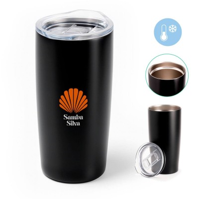 Copo Térmico 590ml, fabricado em aço inox com parede dupla, garantindo resistência e alta eficiência na conservação da temperatura por mais tempo. Possui tampa em plástico com vedação a vácuo e bocal com trava de segurança, que tornam o uso prático e seguro, além de base emborrachada antiderrapante que assegura estabilidade em qualquer superfície. Um brinde moderno e funcional que combina elegância e utilidade para o dia a dia.