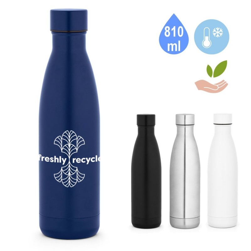 A garrafa térmica em aço inox 90% reciclado com capacidade de 810 mL é uma opção sofisticada e sustentável para ações promocionais que desejam aliar utilidade, responsabilidade ambiental e alto valor percebido. Com parede dupla isolada a vácuo, ela mantém líquidos quentes ou frios por longos períodos, oferecendo desempenho térmico superior. Seu acabamento fosco em mate confere um visual moderno e elegante, ideal para ambientes corporativos, atividades ao ar livre, academias ou o uso no dia a dia. A tampa rosqueável é à prova de vazamentos, proporcionando segurança e praticidade no transporte.