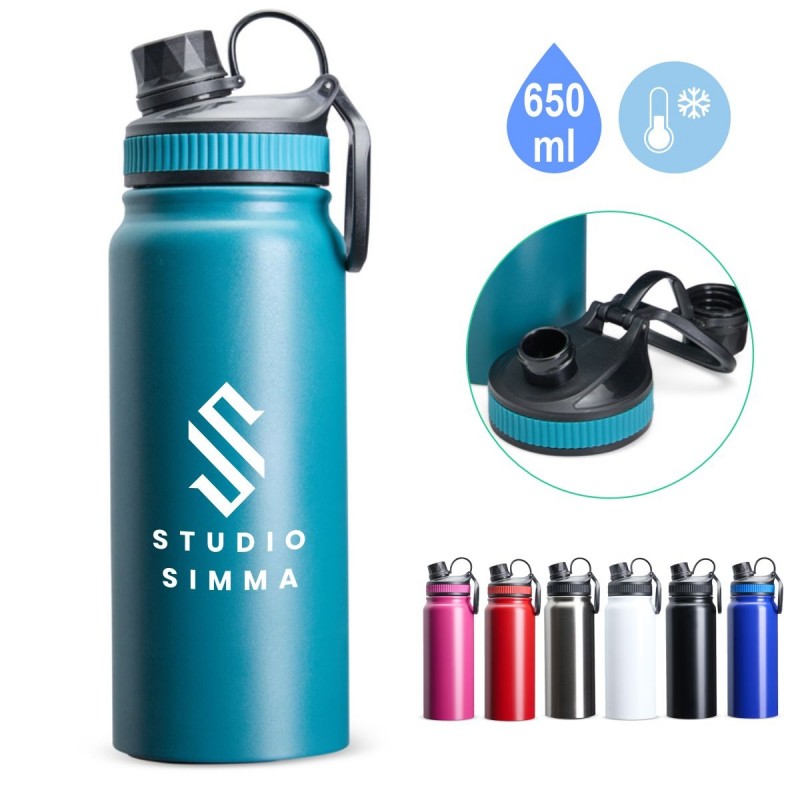 Garrafa térmica em inox 304 com capacidade de 650ml, desenvolvida para manter bebidas quentes ou frias por mais tempo. Conta com tampa rosqueável em plástico com detalhes emborrachados, alça flexível para transporte e base antiderrapante que evita deslizes; uma opção prática e elegante para uso diário, kits corporativos, ações promocionais e programas de bem-estar.