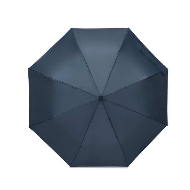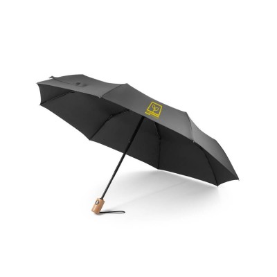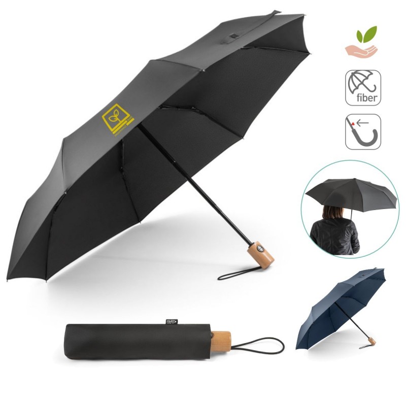 O guarda-chuva dobrável em poliéster 100% reciclado pongee 190T com pega em madeira é um brinde corporativo sofisticado e sustentável, ideal para ações promocionais que valorizam a praticidade e o compromisso ambiental. Desenvolvido com tecido reciclado de alta qualidade, este guarda-chuva alia resistência e elegância, sendo perfeito para proteger contra a chuva com estilo. A estrutura conta com varetas em fibra de vidro que garantem flexibilidade e durabilidade, enquanto a pega em madeira traz um toque clássico e refinado ao produto. Seu design dobrável em três seções facilita o transporte e o armazenamento, e o sistema de abertura e fechamento automático proporciona praticidade e rapidez no uso.