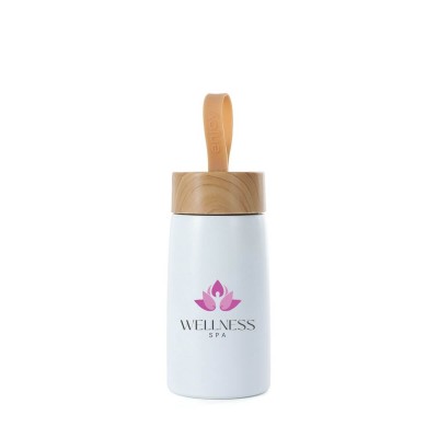 Garrafa isotérmica inox 304 com parede dupla, capacidade de 250ml. Contém tampa plástica com design de bambu e alça de silicone para transporte.