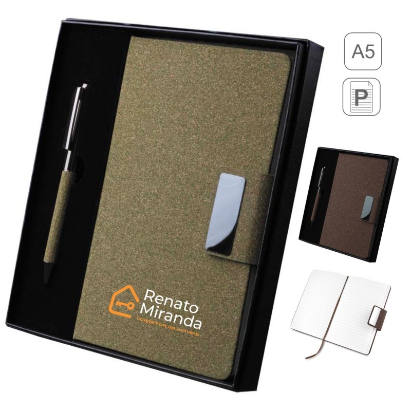 Um brinde corporativo memorável precisa ir além da utilidade ele deve carregar propósito, sofisticação e alinhamento com os valores da sua marca. Esse Kit de Escritório oferece exatamente isso: um conjunto elegante que combina design contemporâneo com um toque sustentável. O caderno em tamanho A5 possui capa em PU com detalhe exclusivo em fibra natural de chá ou café, trazendo um acabamento diferenciado e visual ecológico. Internamente, são 80 folhas pautadas em papel 70g/m², ideais para anotações do dia a dia com conforto e organização. A caneta metálica que acompanha o kit também apresenta o mesmo detalhe em fibra natural, garantindo harmonia visual e um toque refinado ao conjunto.