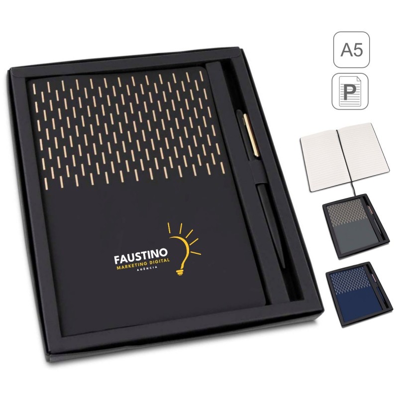 Um brinde corporativo sofisticado e funcional é a escolha ideal para destacar sua marca em eventos, ações promocionais ou kits institucionais. Este conjunto une elegância e responsabilidade ambiental, tornando-se um presente marcante para clientes e colaboradores. O caderno possui capa em PU com acabamento premium e detalhe de gravação dourada, agregando valor estético e refinamento. Conta com 80 folhas pautadas em papel branco 70g/m², perfeito para anotações do dia a dia com estilo. Acompanhando o caderno, o kit inclui uma caneta modelo twist confeccionada em alumínio reciclado, com pintura na mesma cor do caderno e acabamento rosê no clipe, conferindo harmonia e sofisticação ao conjunto.