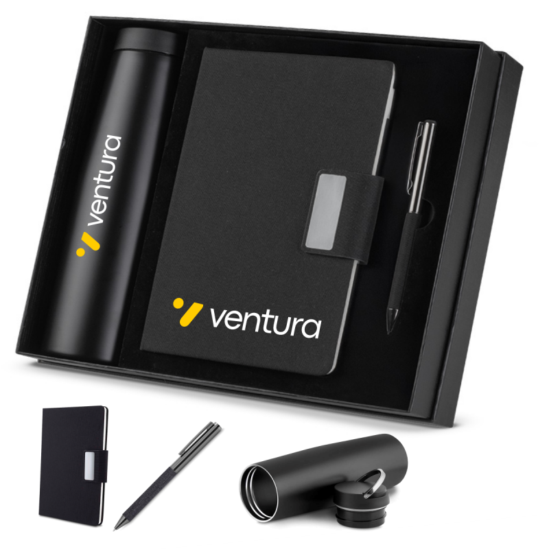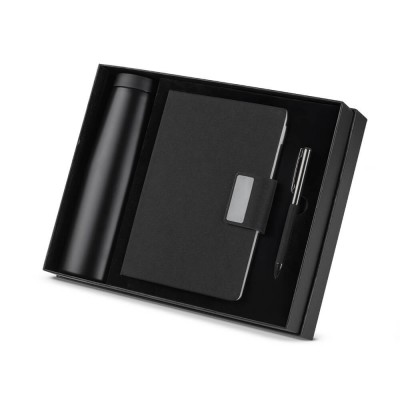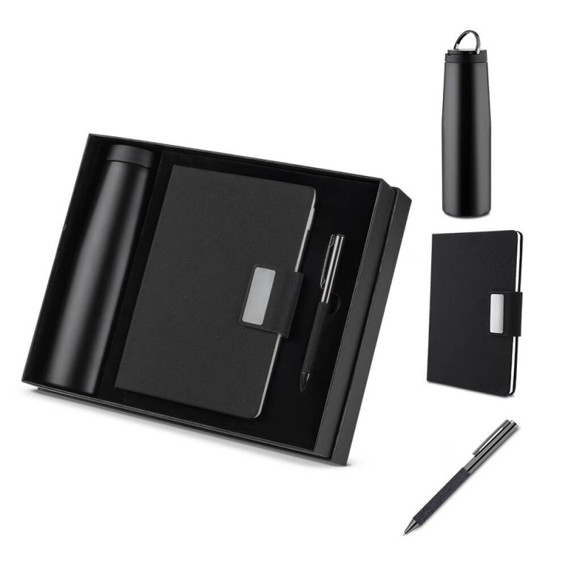Este kit sustentável é a escolha ideal para empresas que buscam brindes corporativos com impacto positivo, elegância e utilidade no dia a dia. Perfeito para ações promocionais, eventos de relacionamento, datas comemorativas e kits de boas-vindas, o conjunto transmite sofisticação e compromisso com a sustentabilidade. Composto por um caderno em material RPET (plástico reciclado de garrafas PET) com fechamento magnético e 100 páginas internas, uma caneta modelo twist com detalhe em tecido RPET preto e uma garrafa térmica de parede dupla em aço inox sendo o interior em inox 304 e o exterior em inox 201 com capacidade de 550ml, o kit combina funcionalidade e responsabilidade ambiental.