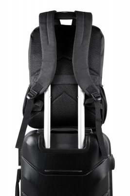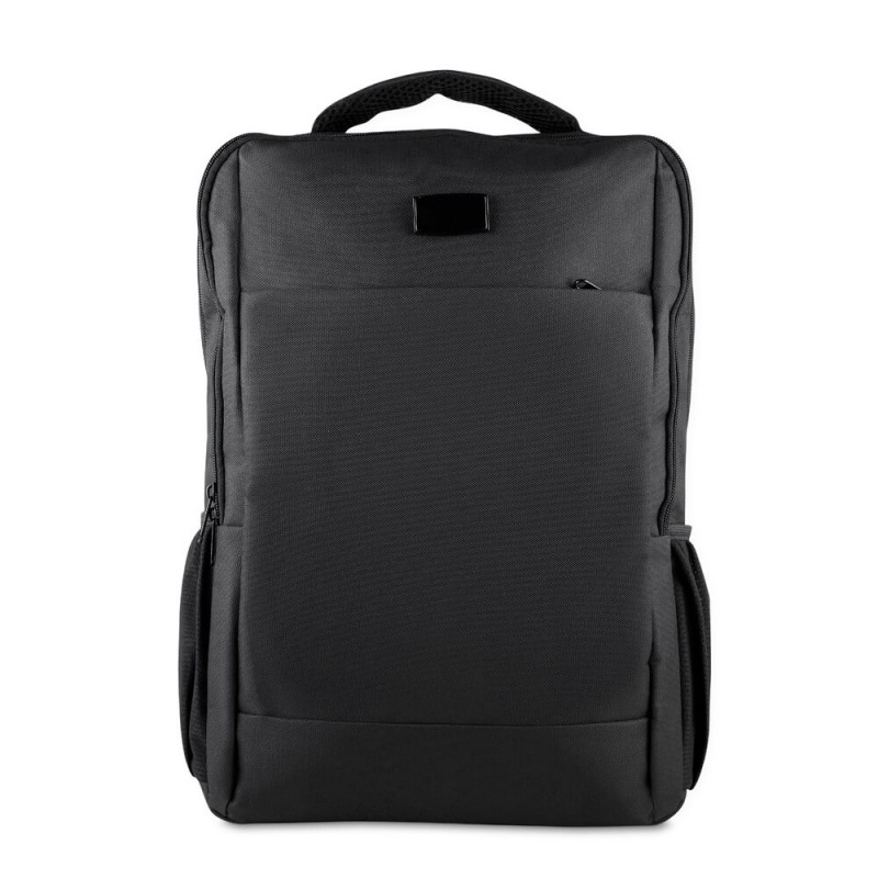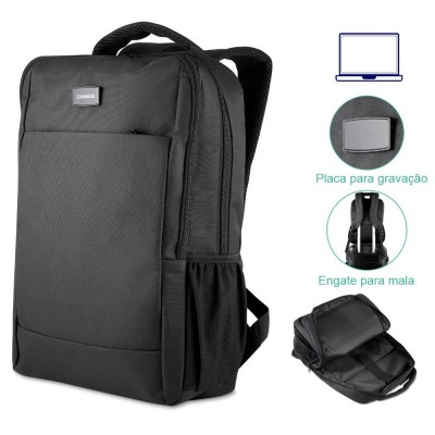 A Mochila Executiva MC120 é confeccionada em poliéster 600D com interior em poliéster 210D, apresentando um perfil compacto com capacidade de 13 litros. Sua organização prática inclui um bolso frontal com zíper, dois bolsos laterais, engate para mala de viagem e dois compartimentos internos com espaço dedicado para notebook de até 15,6 polegadas. O diferencial deste modelo é a plaquinha metálica imantada na parte frontal, projetada para receber a gravação da marca de forma elegante. Com seu design minimalista, é uma opção premium para presentear executivos, palestrantes e diretores em eventos corporativos.