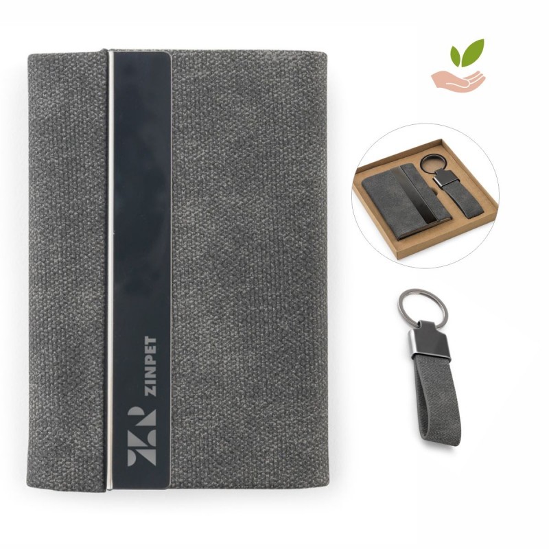 O conjunto composto por um porta-cartões e um chaveiro é a escolha ideal para empresas que desejam presentear com praticidade e sofisticação. Ambos os itens são fabricados em metal combinado com poliéster 30% reciclado, unindo durabilidade, estética moderna e consciência ambiental em um único produto. O porta-cartões tem capacidade para até 7 cartões, sendo perfeito para o dia a dia, viagens ou reuniões, enquanto o chaveiro possui design clean e funcional, ideal para uso pessoal ou corporativo. O conjunto é fornecido em uma caixa presente de papel kraft reciclado, que agrega valor ao presente e reforça o compromisso com a sustentabilidade.