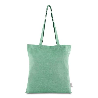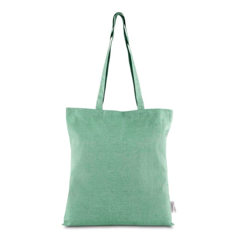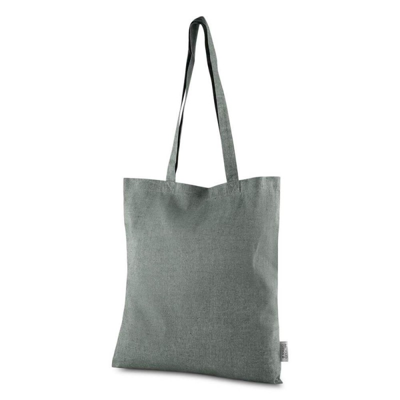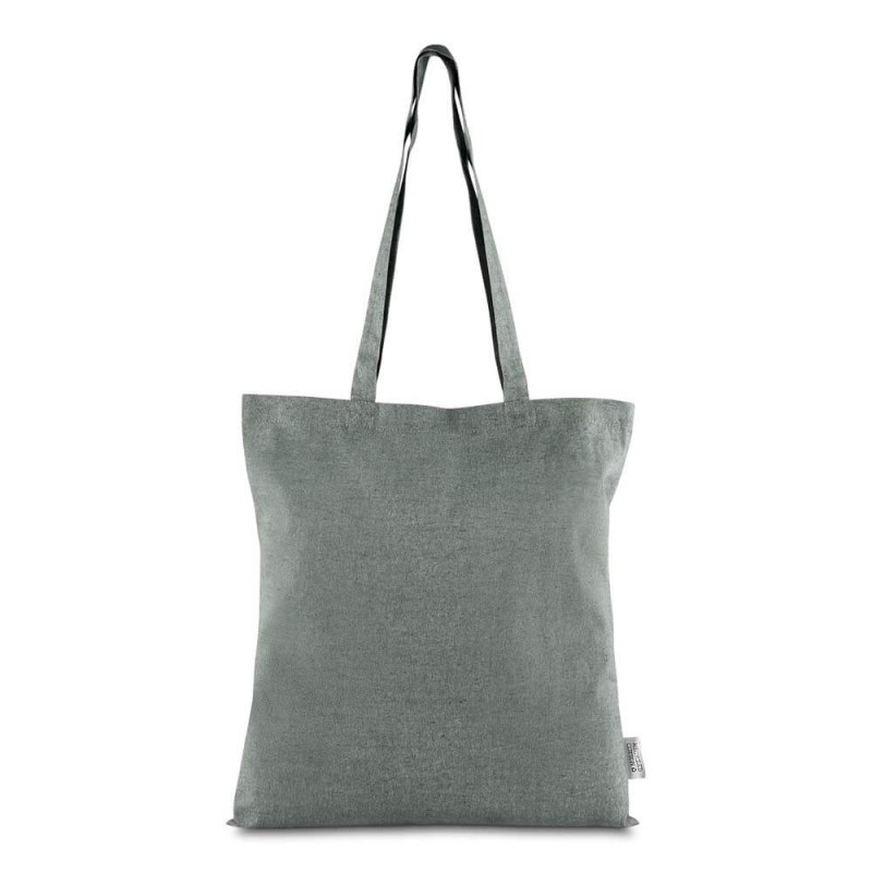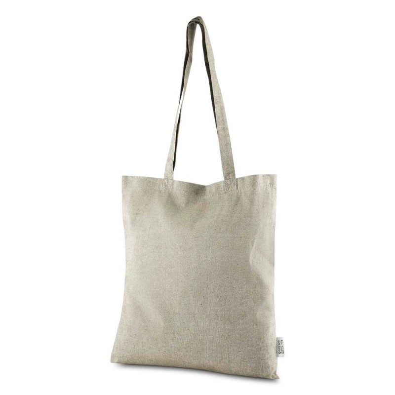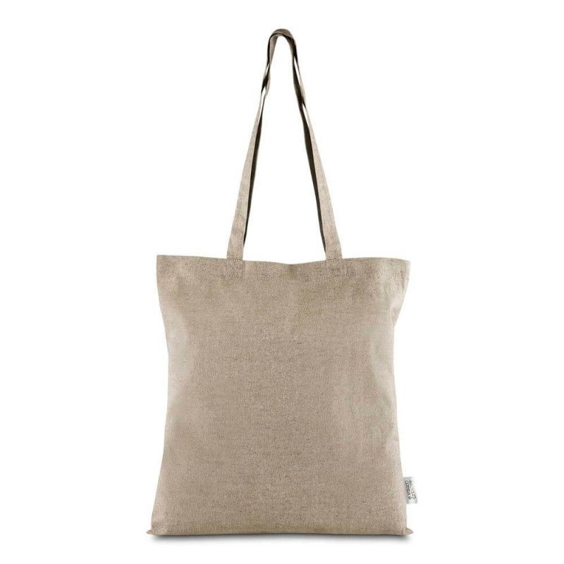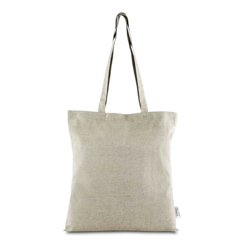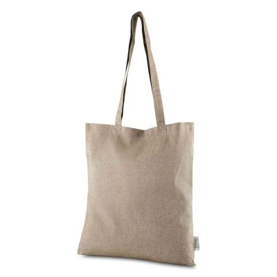 Esta sacola é produzida a partir de fibras de algodão mescla reciclado, com uma gramatura de 140 g/m². O tecido aproveita resíduos têxteis reaproveitados, resultando em um material sustentável e com textura característica. O modelo é finalizado com alças longas de 65 cm (medida de ponta a ponta), dimensionadas para permitir o uso confortável sobre o ombro.