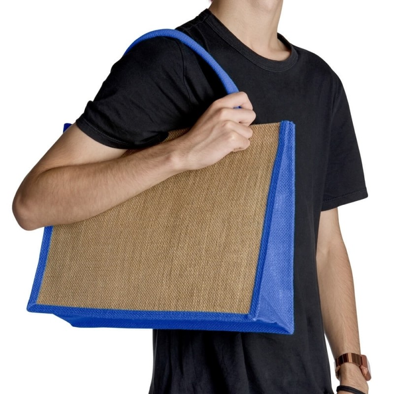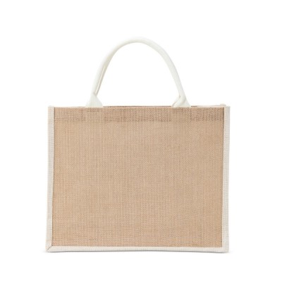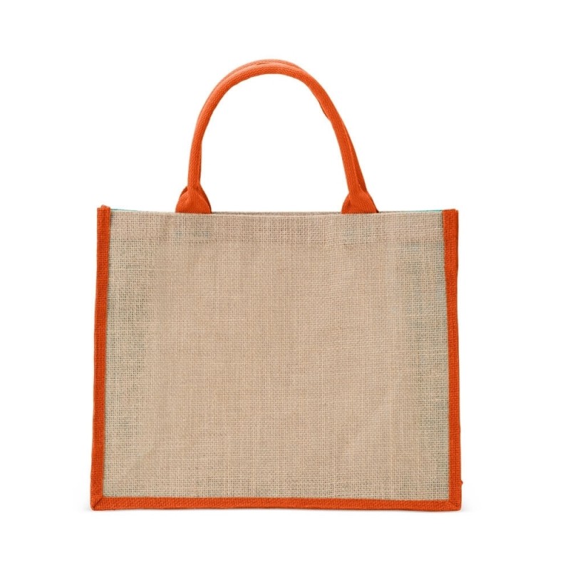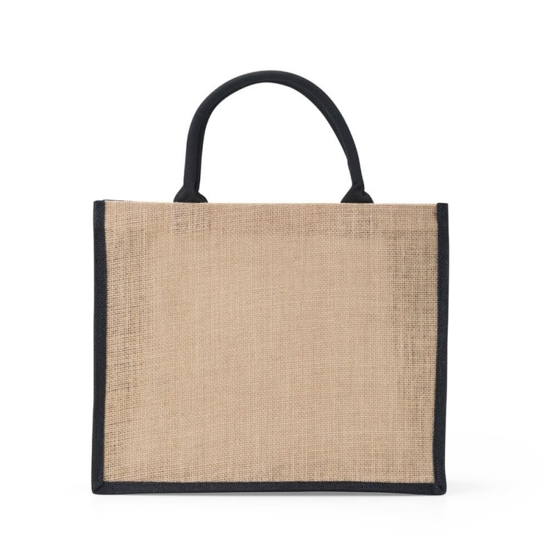 Esta sacola é fabricada em juta, uma fibra natural conhecida pela sua alta resistência e durabilidade. O modelo apresenta um acabamento limpo, com as alças de mão costuradas diretamente na parte interna da sacola, o que reforça a estrutura para suportar o peso de compras ou objetos pessoais sem descosturar.