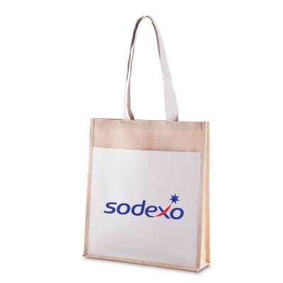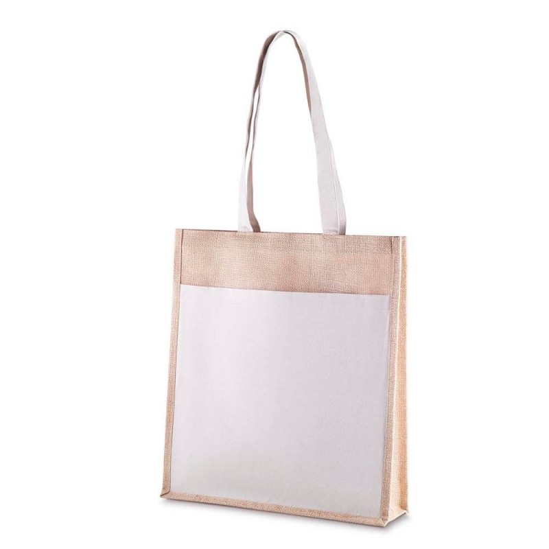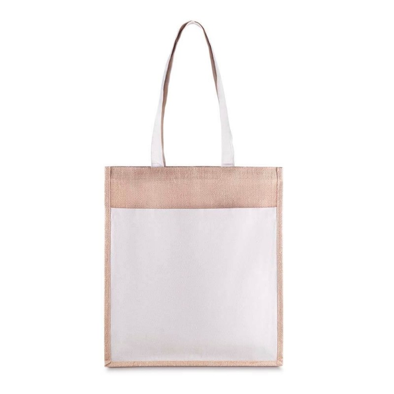 Este modelo é fabricado em juta de alta gramatura (360g/m²), garantindo uma estrutura rígida e de alta durabilidade. Possui um bolso frontal em algodão cru, que facilita a organização de itens menores, e alças reforçadas também em algodão cru com 30 cm de altura. Tecnicamente, destaca-se pelo seu interior totalmente revestido em plástico PP (polipropileno) e pela base plana, que permite que a sacola se mantenha estável quando colocada em superfícies.