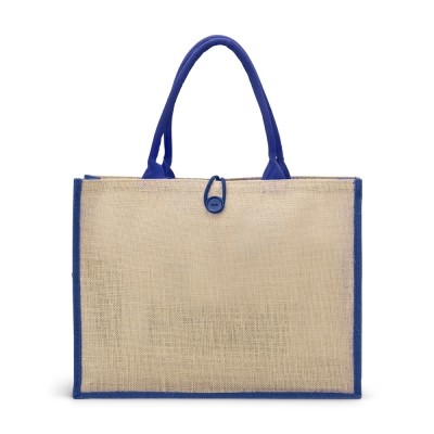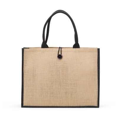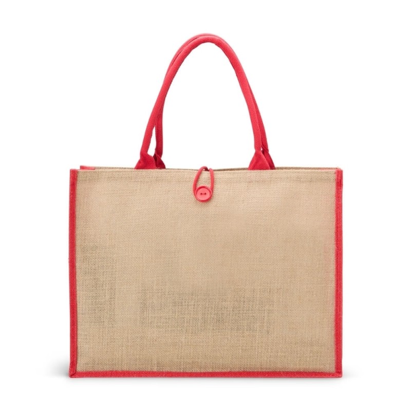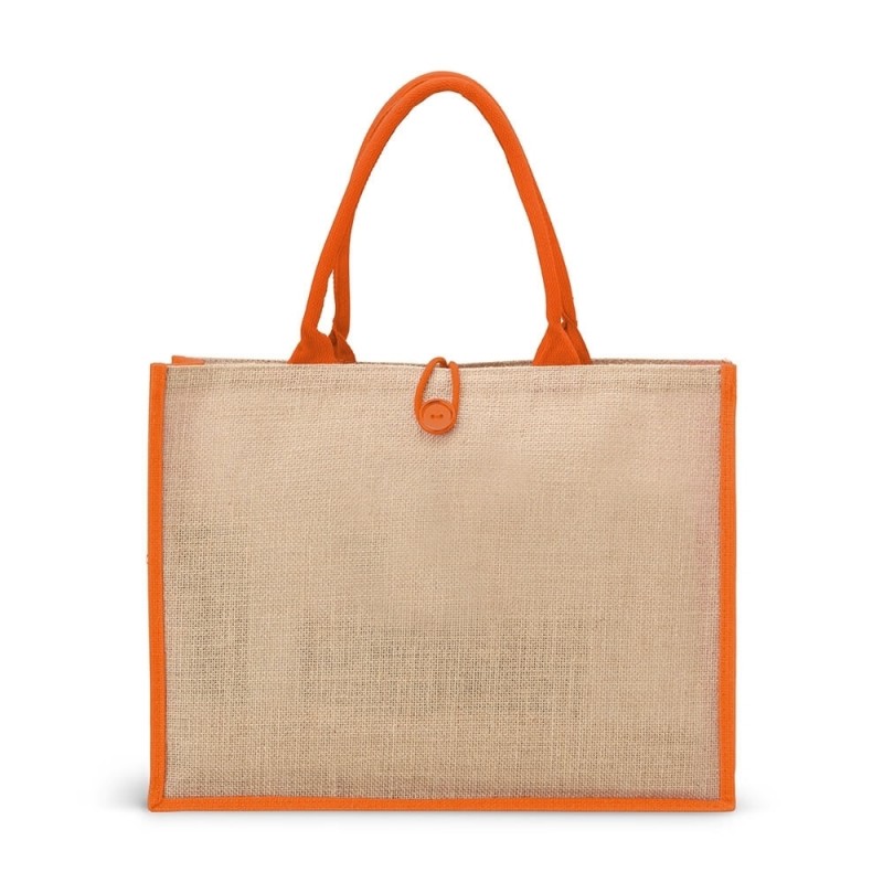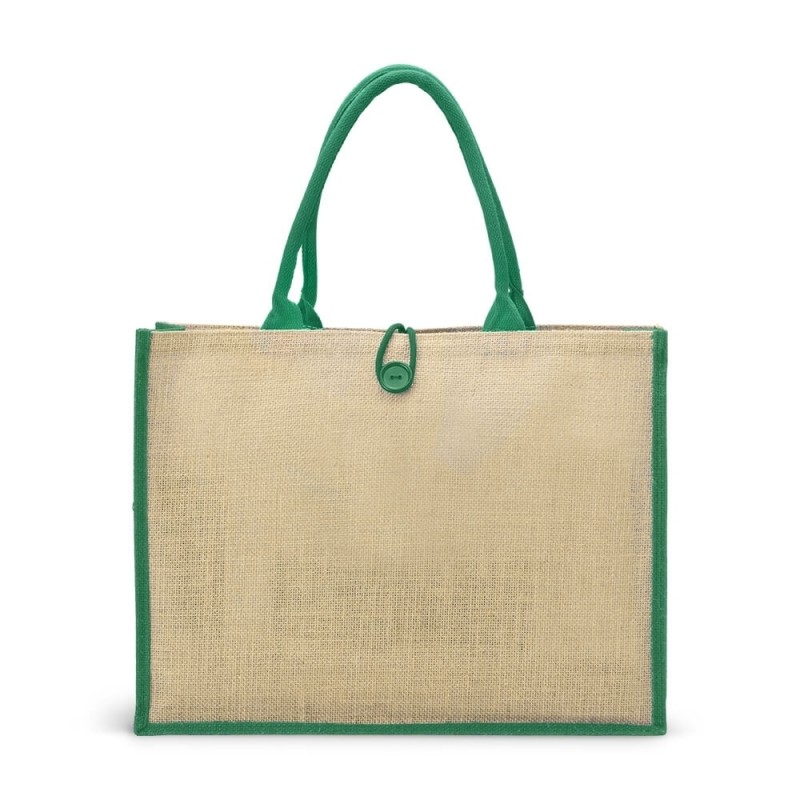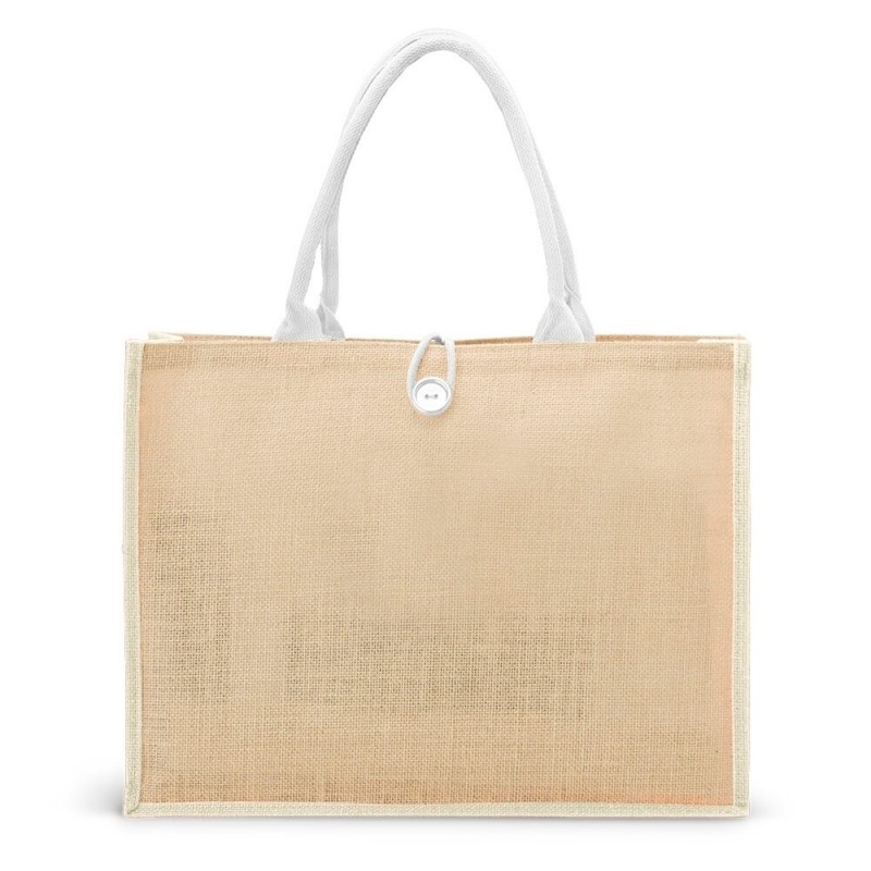 Esta sacola é confeccionada em juta, uma fibra natural resistente, e conta com um botão superior para fechamento, garantindo que os objetos fiquem seguros no interior. Possui alças reforçadas que permitem o transporte tanto no ombro quanto na mão, adaptando-se à carga que você estiver carregando.