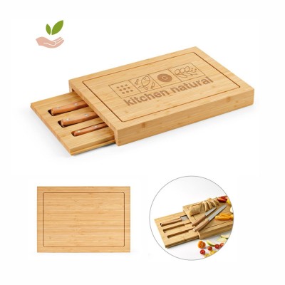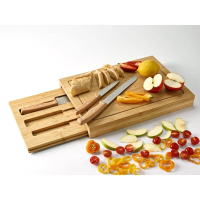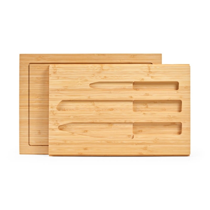 Este conjunto de tábuas em bambu com facas é uma escolha sofisticada e funcional para brindes corporativos que surpreendem pela utilidade e design. Composto por duas tábuas uma exterior e uma interior o produto se destaca por seu design inteligente: a tábua interior funciona tanto como base de corte quanto como compartimento para três facas inclusas (faca de legumes, faca de pão e faca de cozinha). Fabricado em bambu natural, um material resistente e sustentável, este conjunto é ideal para o uso diário em preparos culinários com praticidade e elegância.