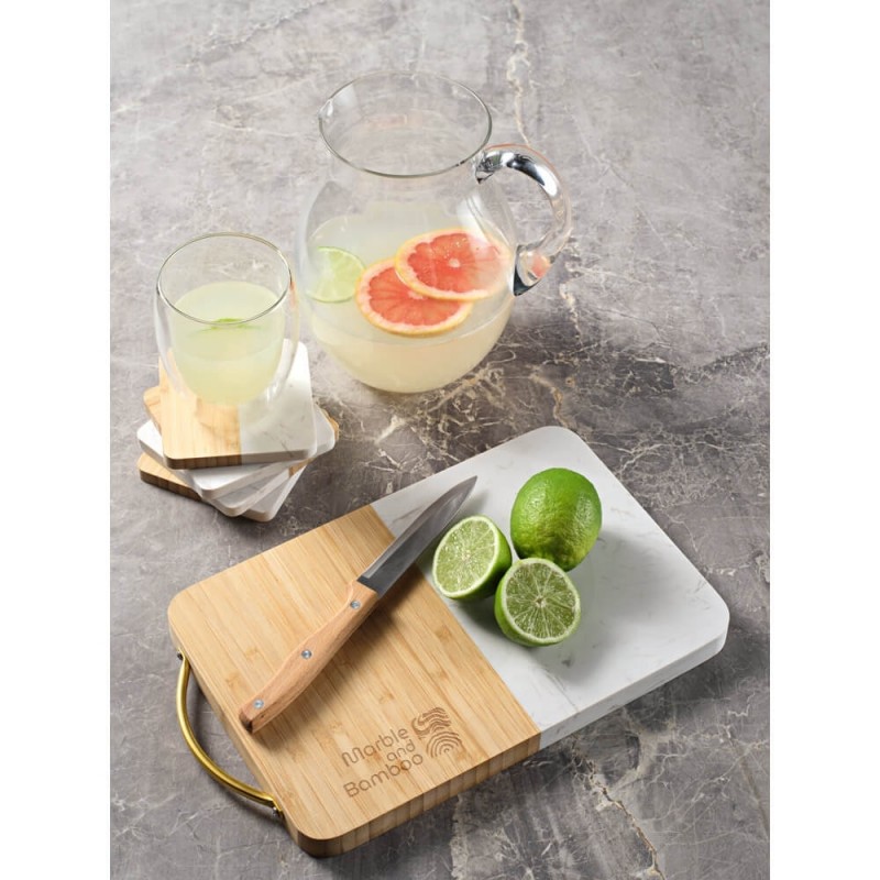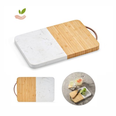 A tábua de corte em bambu e mármore é um brinde sofisticado que combina design contemporâneo com materiais naturais de alta qualidade. Seu formato retangular une a leveza e resistência do bambu à durabilidade e elegância do mármore, criando uma peça funcional e decorativa para qualquer ambiente gourmet. A pega metálica adiciona praticidade ao dia a dia, facilitando o transporte e permitindo pendurar a tábua para melhor organização e visual valorizado. Produzida com bambu proveniente de fontes renováveis e entregue em caixa presente de papel kraft reciclado, é uma escolha consciente para marcas que desejam destacar seus valores sustentáveis.